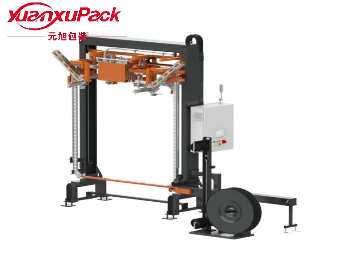 适合托盘尺寸较多的产品打包,可以根据物料的长度设定打包带对于托盘边沿的距离,不同方向可以设定不同的打带数量,可配转盘完成井字形打带