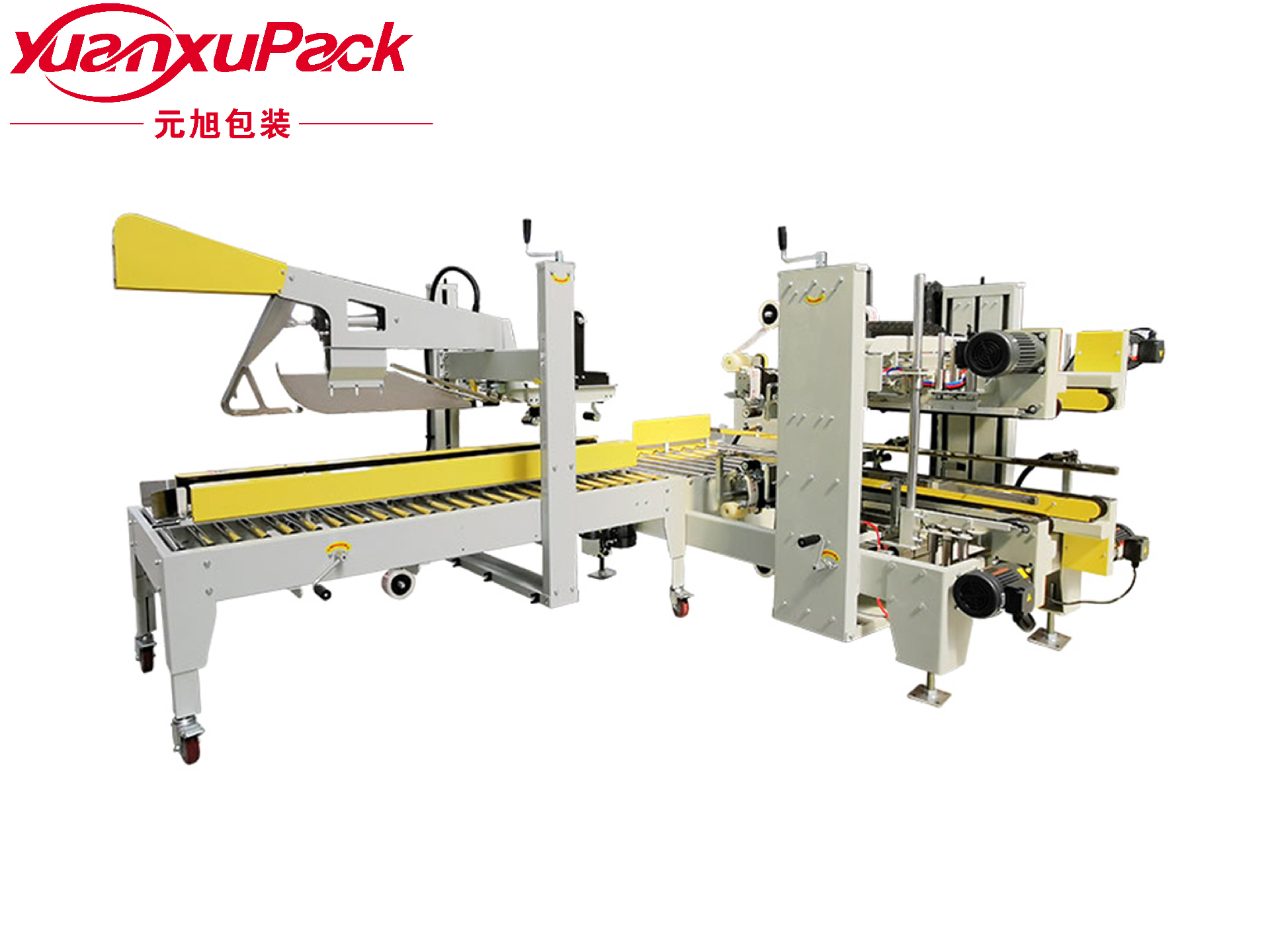 折盖封箱机+角边封箱机可自动折合顶盖,两侧马达驱动皮带自动校正、输送纸箱,封箱时快速平稳,同时对纸箱进行上下“一”字型封箱,两侧辅助轮协助机器封箱时中缝集中不开裂。紧接着通过L型转角推送,输送进纸箱进行四角边封箱作业。纸箱尺寸变动时需由人工调节尺寸,仅需1分钟即可完成。台面高度、纸箱宽度高度可自主调节,简单实用。造型典雅大方,配备刀片防护装置,避免操作时意外刺伤。机身自带四个高强度刹车轮,换位工作非常方便。机件稳固耐用,使用寿命长。